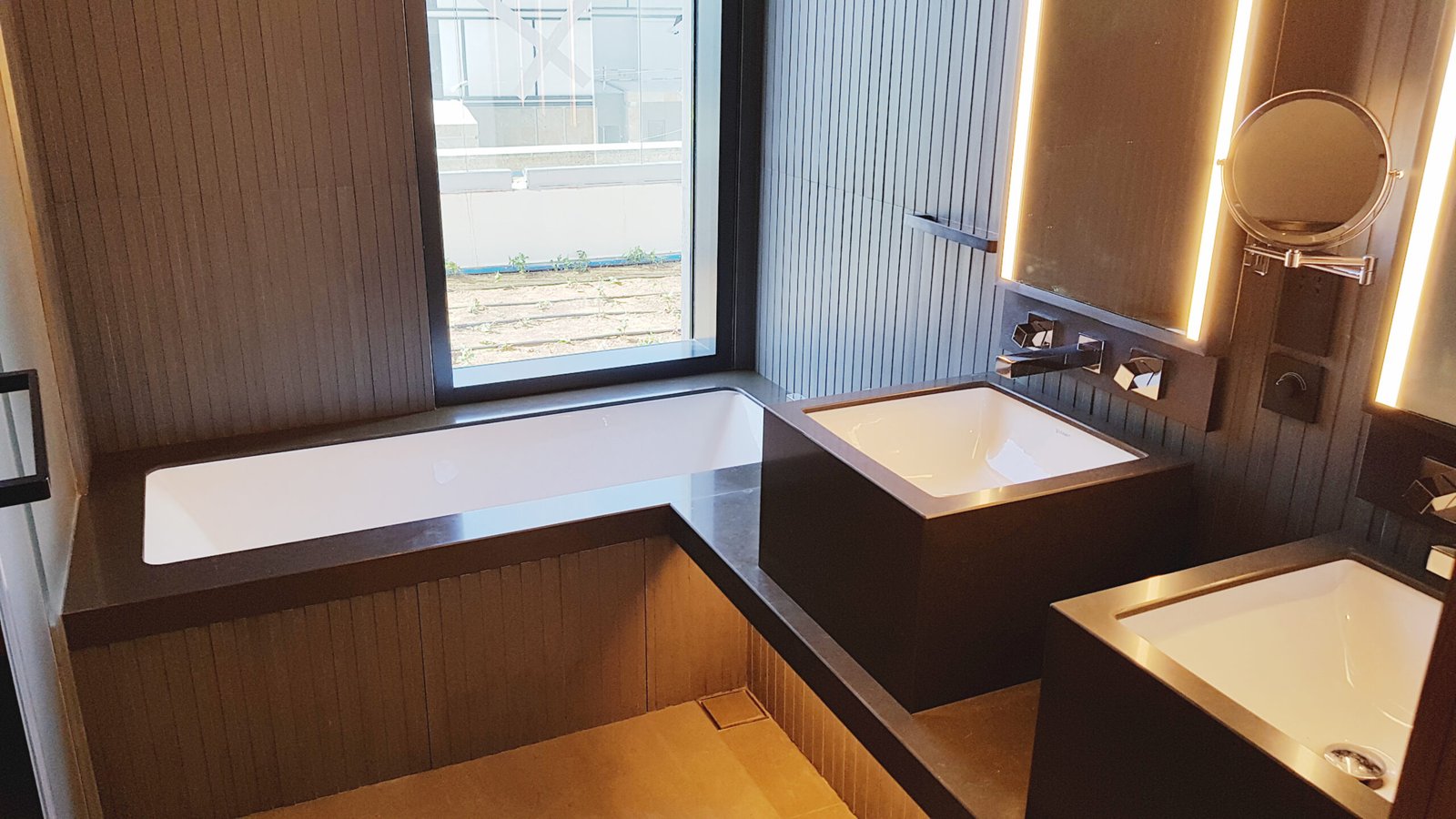 Considerable attention was directed to the floor and wall tiling, with large black floor tiles of 1500mm x 750mm, and ribbed feature wall tiling, all of which required very careful setting out, and millimeter tolerance to grout lines, and to gypsum/glazing and tiling interfaces within the bathroom areas to provide a perfect seamless transition between materials. A challenging project to undertake, but one in which our company were able to excel, and provide a high quality end product.